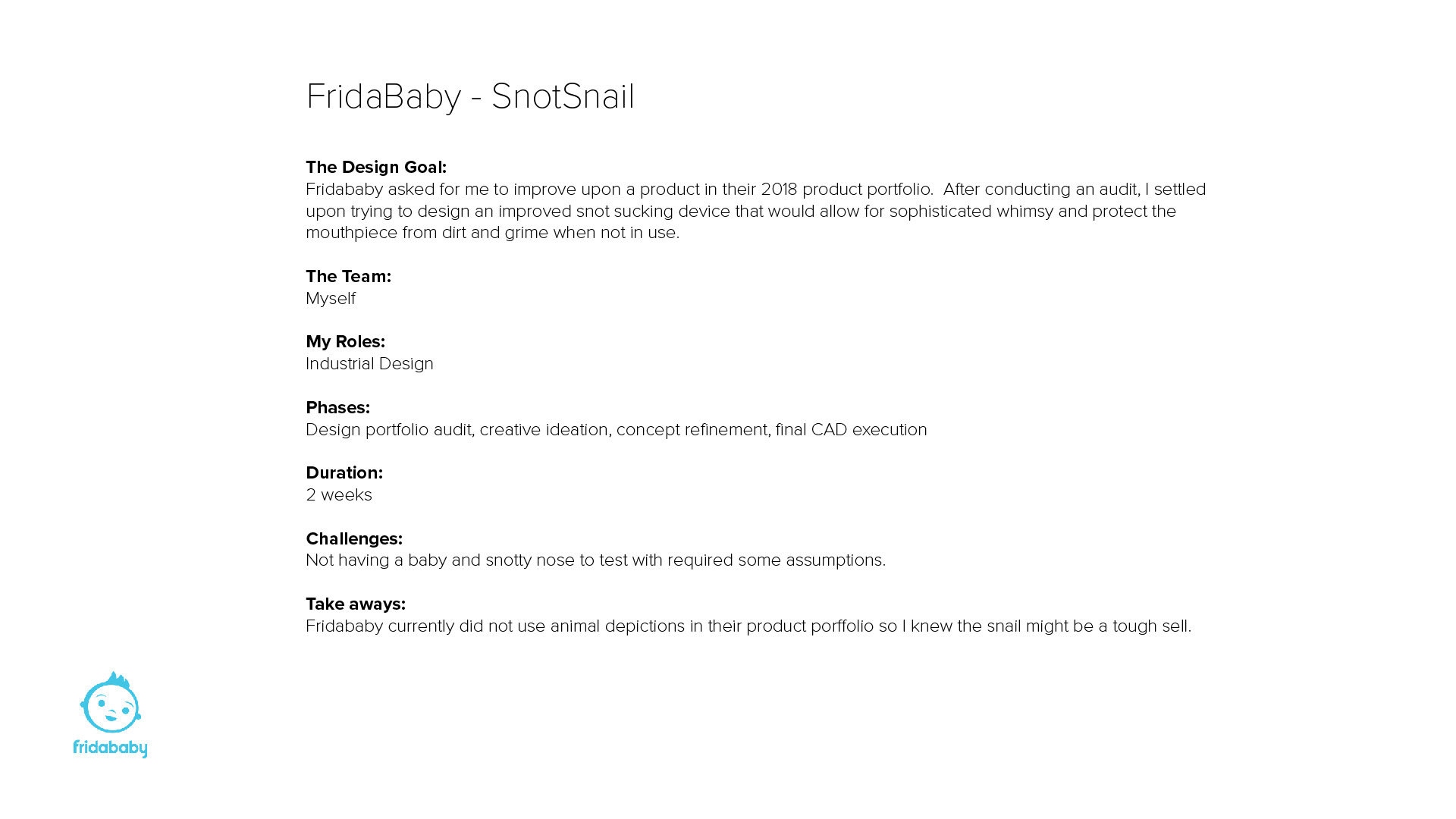 FridaBaby asked if I might look at their 2018 product porfolio and improve upon an existing product. After conducting an audit, I settled upon trying to design an improved snot sucking device that would allow for sophisticated whimsy and protect the mouthpiece from dirt and grime when not in use.